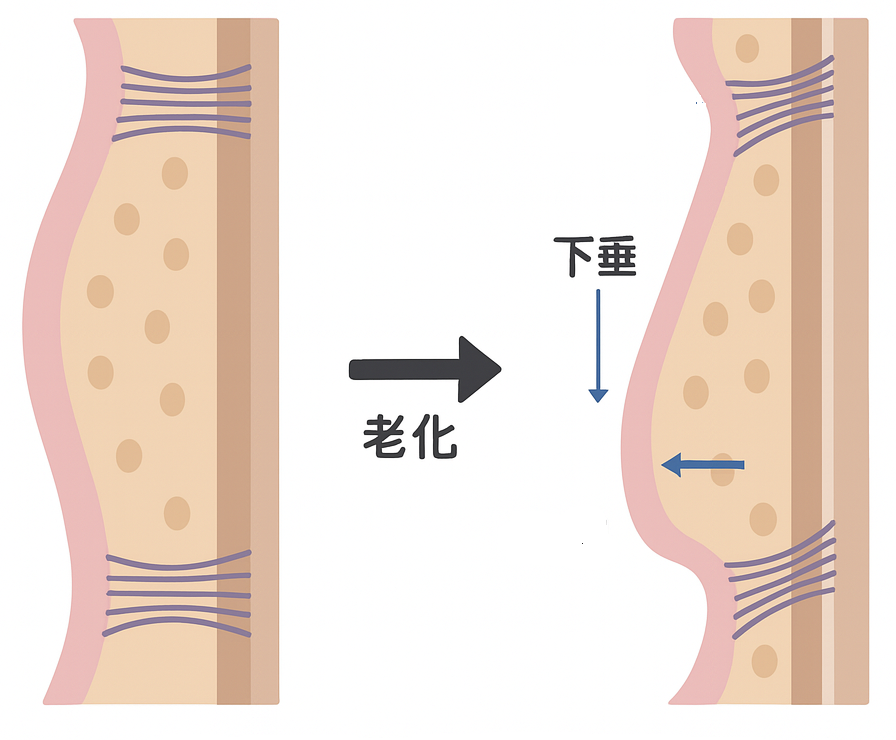 加齢により骨が痩せ、脂肪組織が減少するため、しぼんだ風船のように皮膚が余る減少が起こります。これにより余った皮膚・組織が重力により下に落ち、たるみになります。さらに、たるみによって落ちた組織の重さで、組織を支える靭帯という杭のようなものが緩むと、より一層皮膚は下へ下へと落ち、たるみの無限地獄です😱😱😱