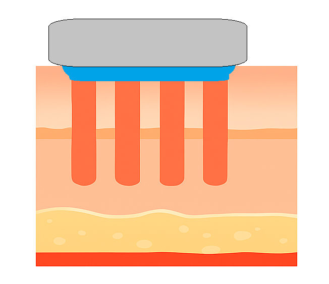 HIFUと同じ超音波ですが、深さは1.5mmと比較的浅い層に円柱の柱のように熱を作り出します。HIFUで度々問題となっている『コケすぎ』の副作用を起こさず、たるんだ真皮を引き締める機械です。